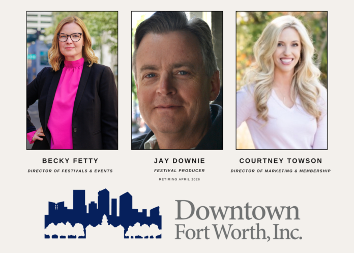 Downtown Fort Worth, Inc. (DFWI) has begun a strategic leadership transition, including the retirement of longtime Festival and Event Producer, Jay Downie, the promotion of Becky Fetty from Director of Marketing and Membership to Director of Festivals and Events and the recent hiring of Courtney Towson as Director of Marketing and Membership.