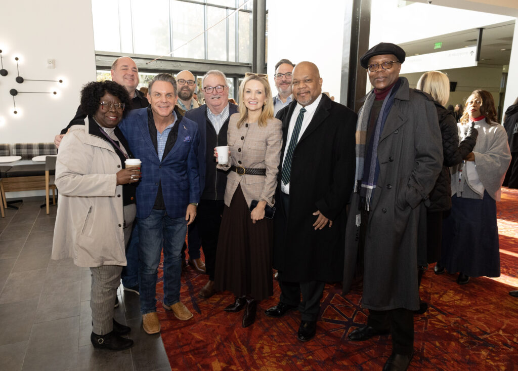 Elected and tourism officials, business leaders and construction partners gathered at the striking new southeast entrance, which includes a lantern box atrium lobby and retail coffee bar called Beltbuckle Brew.