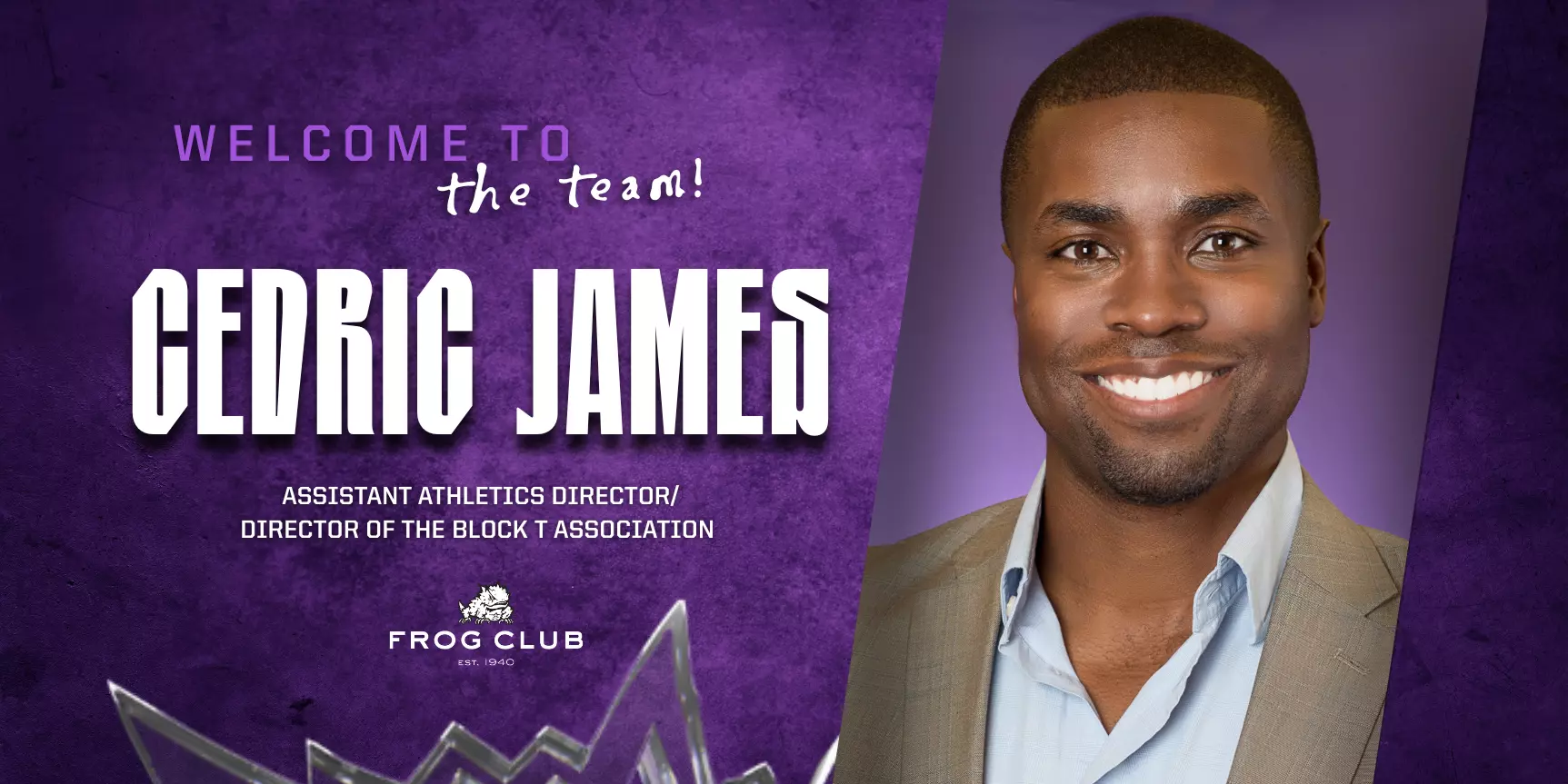 TCU Frog Club has announced the hiring of Cedric James as Assistant Athletics Director / Director of the Block T Association. Cedric James, a proud TCU alumnus and former NFL player, will oversee donor engagement, membership growth and operations for the Block T Association, including administration of the TCU Athletics Hall of Fame.